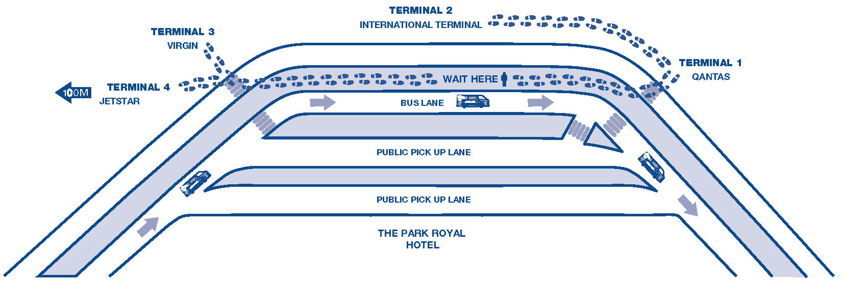 JETSTAR Terminal – Turn left out of the terminal and walk along the pedestrian walkway towards the Virgin Terminal. Walk across the first pedestrian crossing in front of the Virgin Terminal. Turn left and continue down to the bus shelters located near the Qantas pedestrian overpass and await collection.